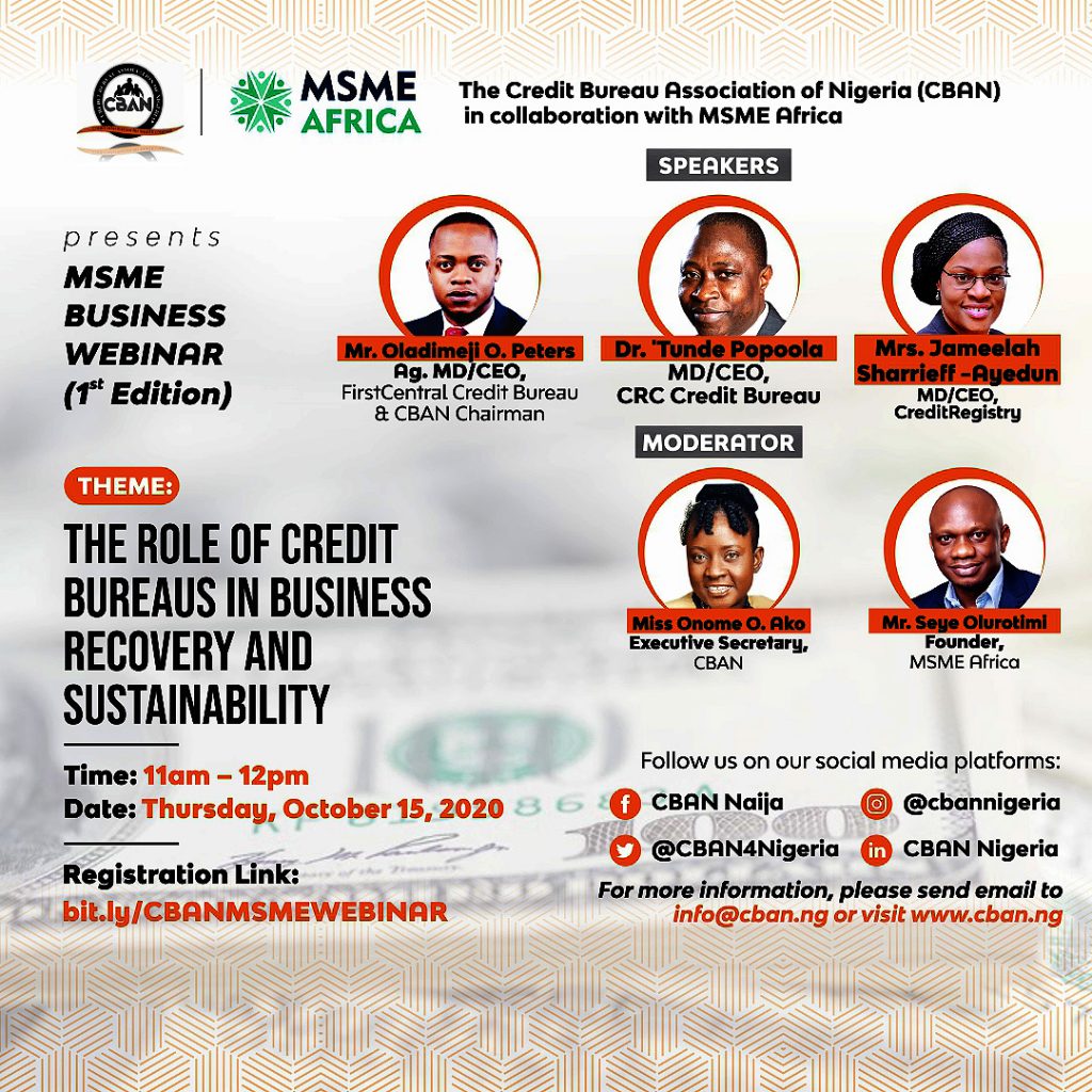 The Credit Bureau Association of Nigeria (CBAN) in collaboration with MSME Africa Online will be hosting the first edition of their jointly organized MSME Business Webinar Series on Thursday, October 15, 2020 at 11am.
