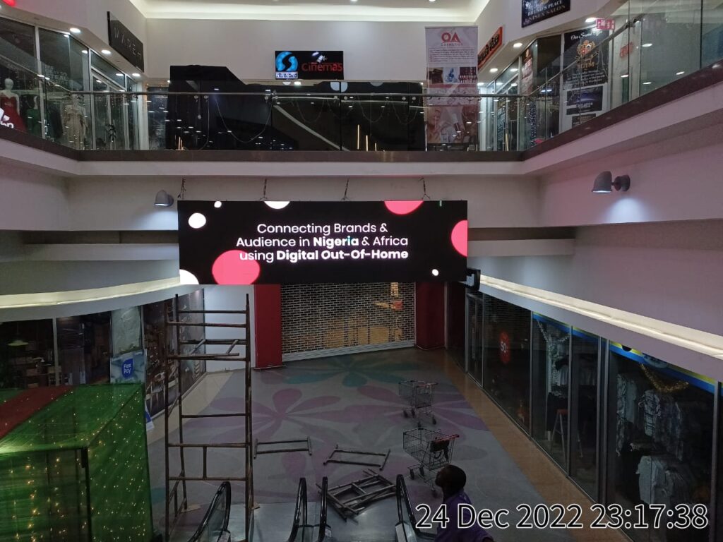 Each screen measures 17.5sqm in area 7m width by 2.5m height each with one located at the Shoprite entrance of the mall directly above Shoprite and Ventor furniture and the other digital screen located at the Silverbird section of the mall directly above Games.