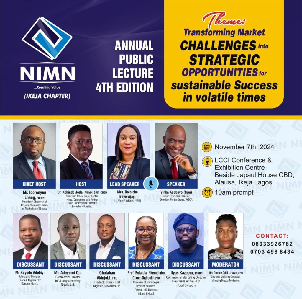 The Ikeja Chapter of the National Institute of Marketing of Nigeria (NIMN) is set to hold the fourth edition of its annual public lecture on November 7 2024 at the LCCI House, Nurudeen Olowopopo Way CBD, Alausa Ikeja by 10 am.