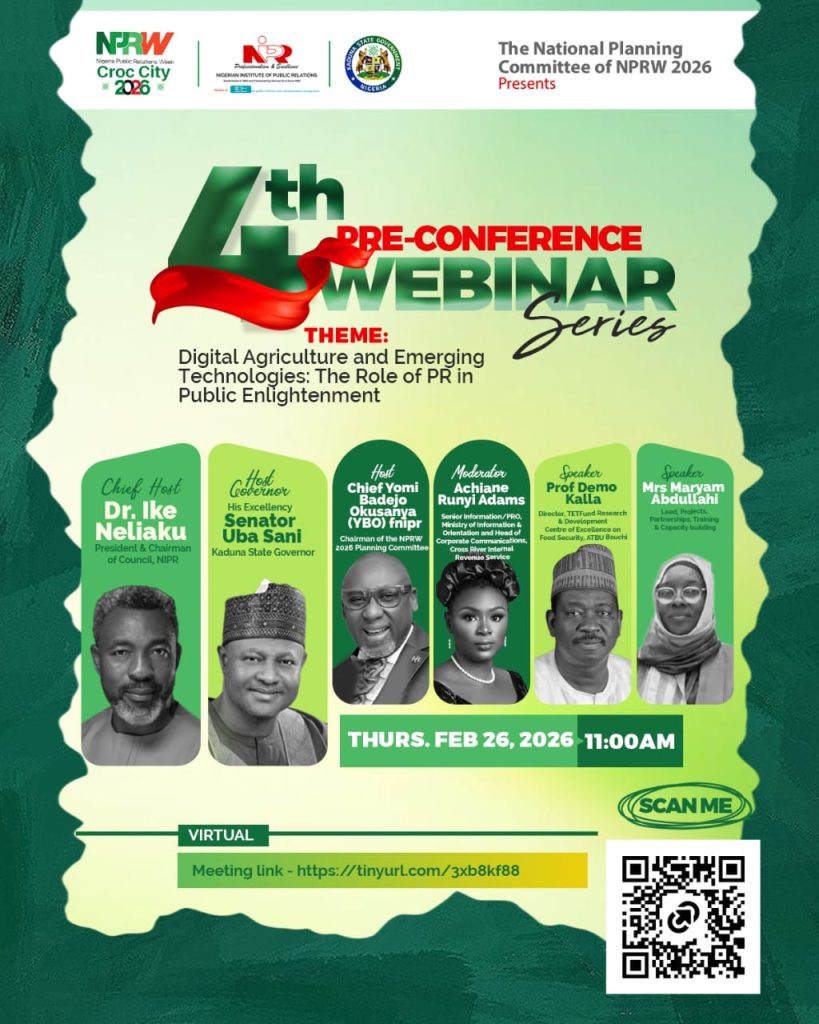 The National Planning Committee of Nigeria Public Relations Week (NPRW) 2026 will host its fourth pre-conference webinar on Thursday, February 26, at 11:00 AM WAT. The session is part of a series designed to prepare PR professionals for the main conference in Croc City.